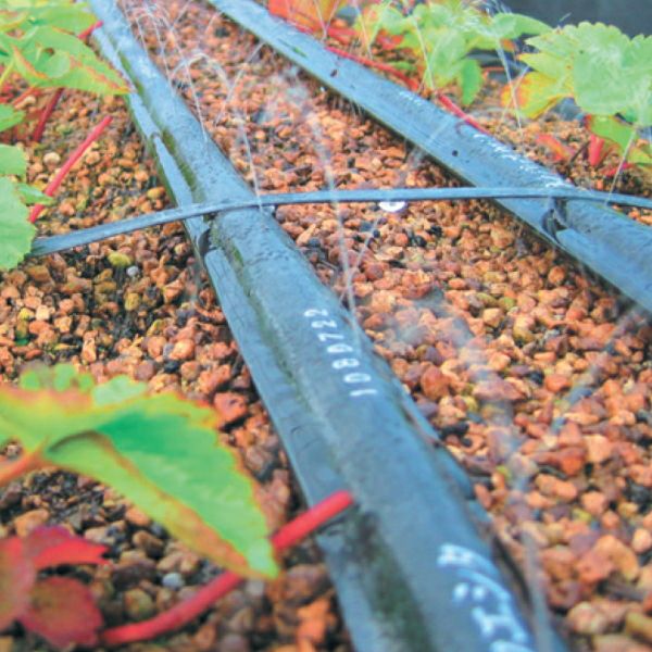 ・独自の二重管構造により、散水幅を片側15cm以内に収めることができるため、イチゴの高設栽培や無マルチ栽培などにも最適です。