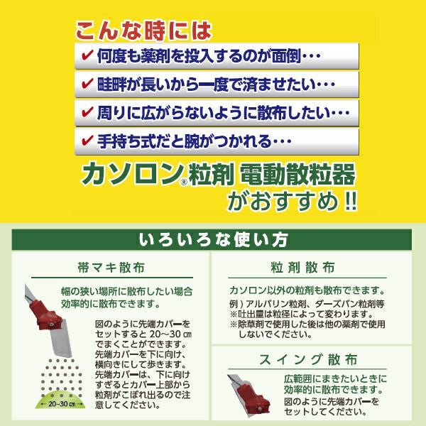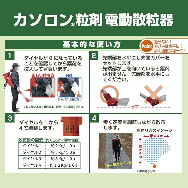 他の画像を見る 手軽に広範囲に散布!様々な粒剤の散布が可能! カソロン粒剤 電動散粒器 (電動シャトル2) 容量約15kg 電池式 販売価格 ¥ 42,900 税込 カートに入れる お気に入りに登録する (0)