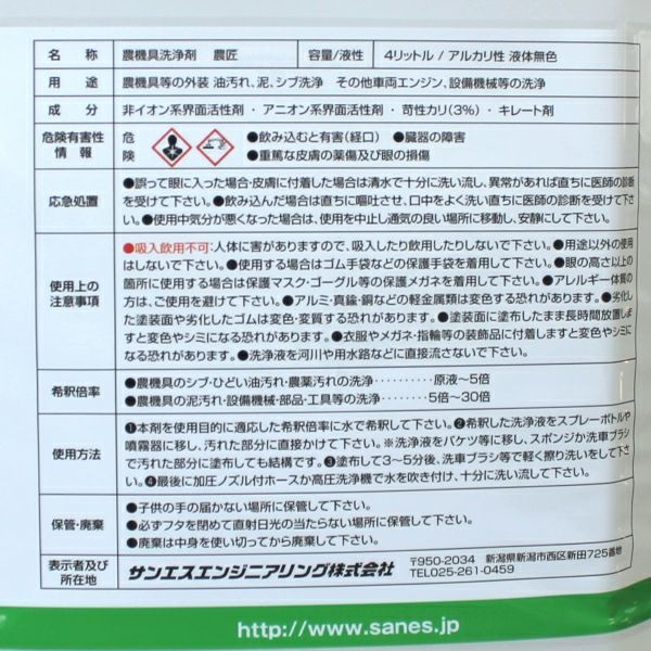 他の画像を見る 農機具 刈払機 泥汚れ 草シブ 農薬汚れ 洗浄 メンテナンス サンエスエンジニアリング 農機具万能洗浄剤 農匠 4L 販売価格 ¥ 4,500 税込 カートに入れる お気に入りに登録する (0)