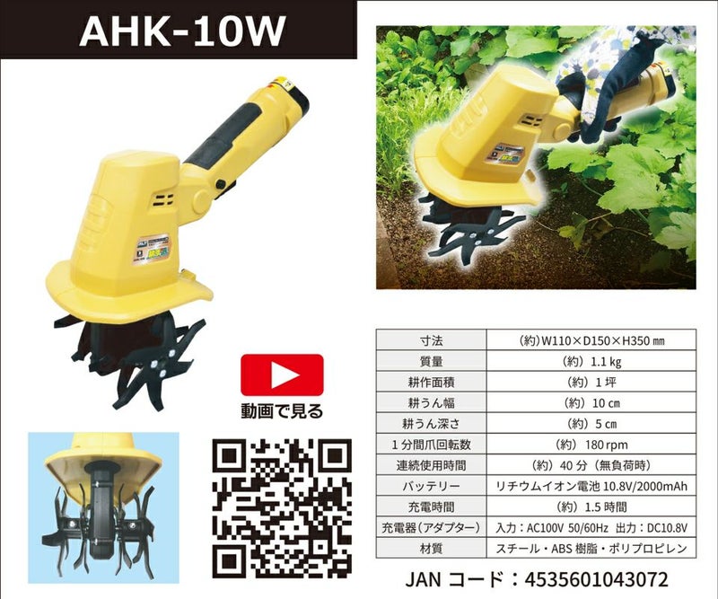 他の画像を見る 【家庭菜園・園芸に最適】【コンパクトで手軽に使える充電式】 アルミス 家庭用 充電式耕運機 耕す造 AHK-10W 販売価格 ¥ 7,980 税込 カートに入れる お気に入りに登録する (0)
