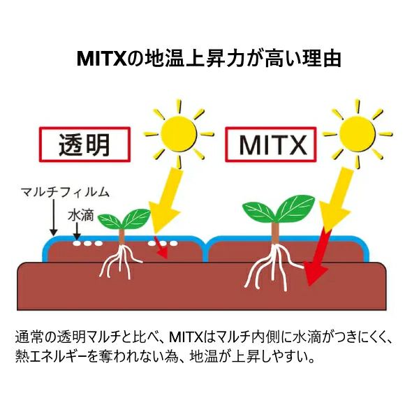 他の画像を見る 【通常の透明マルチよりも高い地温上昇効果!】 みかど化工 MITX 厚み0.02mm 幅95cm×長さ200m 無孔 5本セット (地温上昇特化マルチ) 販売価格 ¥ 33,550 税込 カートに入れる お気に入りに登録する (0)