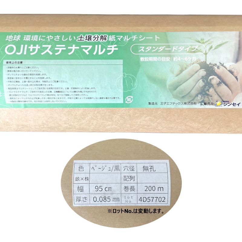 他の画像を見る 環境配慮(脱プラに貢献)・温暖化防止資材 シンセイ 土壌分解紙マルチ OJIサステナマルチ 厚0.085mm×幅95cm×長さ200m 無孔 ベージュ/黒 販売価格 ¥ 11,000 税込 在庫切れ 詳細を見る お気に入りに登録する (0)