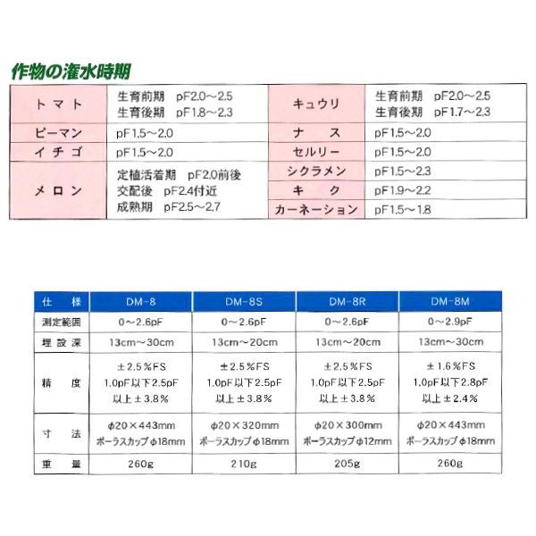 他の画像を見る 竹村電機製作所 土壌水分計(pFメーター) 真空計付 テンションメーター DM-8M メロン用 0~2.9pF 販売価格 ¥ 15,180 税込 カートに入れる お気に入りに登録する (0)