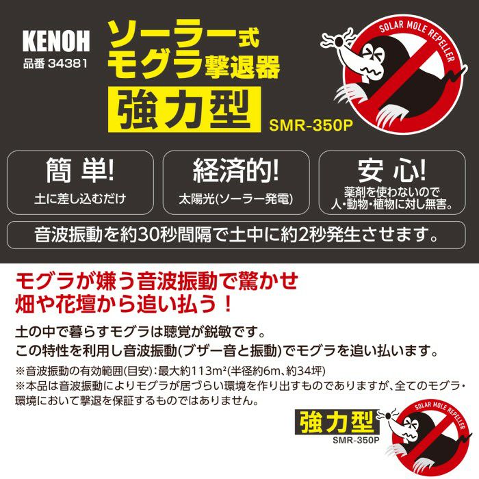 他の画像を見る もぐらよけ 害獣用品 撃退 差込み 音波振動 畑 花壇 KENOH ソーラー式 モグラ撃退器 強力型 SMR-350P 品番34381 販売価格 ¥ 2,380 税込 カートに入れる お気に入りに登録する (0)