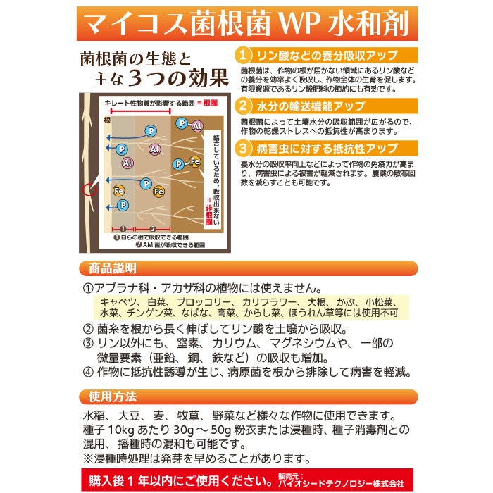 他の画像を見る VA菌根菌 アーバスキュラー菌根菌 バイオスティミュラント資材 養分吸収向上 耐病性向上 マイコス菌根菌 WP水和剤 1kg 販売価格 ¥ 9,990 税込 カートに入れる お気に入りに登録する (0)