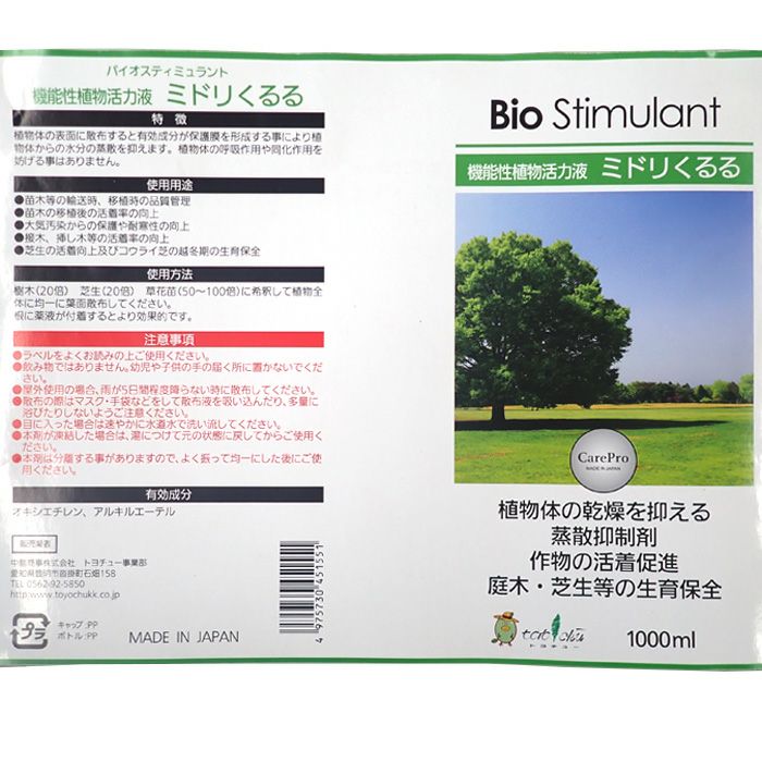 他の画像を見る 作物の活着促進、庭木・芝生等の生育保全 バイオスティミュラント資材 機能性植物活力液 ミドリくるる 1L 植物体の乾燥を抑える蒸散抑制剤 販売価格 ¥ 3,608 税込 カートに入れる お気に入りに登録する (0)