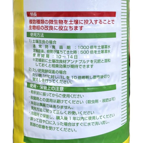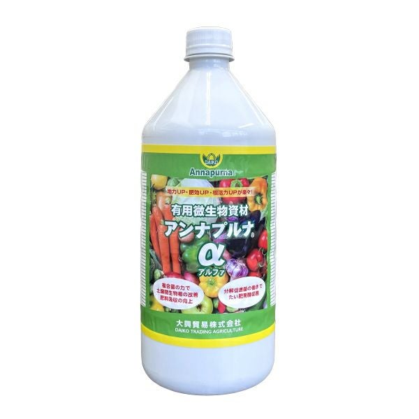 他の画像を見る 【微生物の働きで地力・肥効・根活力UP!】 ダイコー 有用微生物資材 アンナプルナ アルファ (アンナプルナα) 1L バイオスティミュラント資材 販売価格 ¥ 3,520 税込 カートに入れる お気に入りに登録する (0)