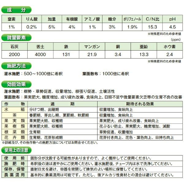 他の画像を見る 【有機JAS規格別表1適合資材】【日本アルコール産業】 植物性発酵有機液体肥料 サトウキビのちから水 オーガニック 1L アミノ酸/糖/有機酸/微量要素 販売価格 ¥ 1,320 税込 カートに入れる お気に入りに登録する (0)