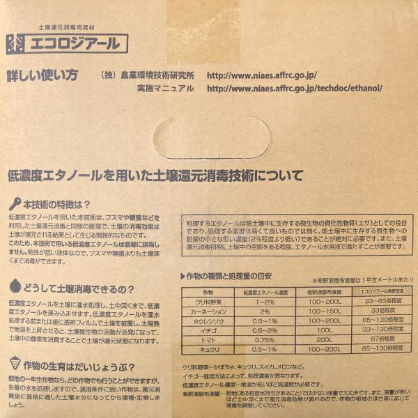 他の画像を見る 【連作障害対策】【農薬ではないため人・環境にやさしい】 低濃度エタノール 土壌還元消毒資材 エコロジアール 20L 販売価格 ¥ 4,500 税込 カートに入れる お気に入りに登録する (0)