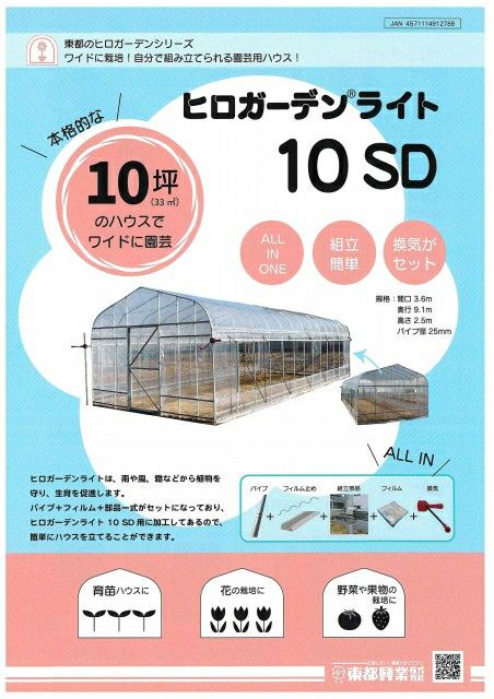 他の画像を見る プロ仕様 東都興業 ヒロガーデン10 本格ビニールハウス 10坪タイプ 3.6m×9.1m×2.5m 換気セット標準装備 販売価格 ¥ 286,000 税込 カートに入れる お気に入りに登録する (0)