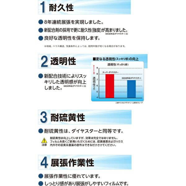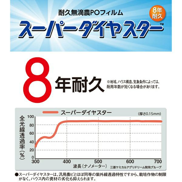 他の画像を見る 【MKVアドバンス】【ビニールハウス外張り用】 耐久無滴農POフィルム スーパーダイヤスター 厚さ0.15mm 幅を選択し数量に長さ(m)を入力 販売価格 ¥ 1,007 税込 〜 販売価格 ¥ 税込 詳細を見る お気に入りに登録する (0)