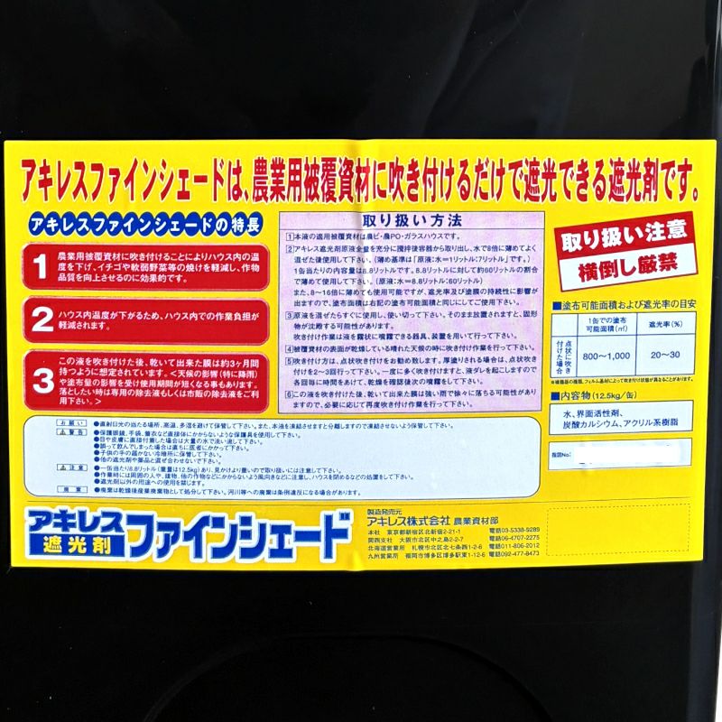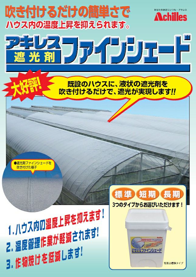 他の画像を見る 【ビニールハウスに吹き付けるだけの遮光剤】 アキレス ファインシェード 標準タイプ 8.8L ハウス用遮光剤 遮熱資材 販売価格 ¥ 15,950 税込 カートに入れる お気に入りに登録する (0)