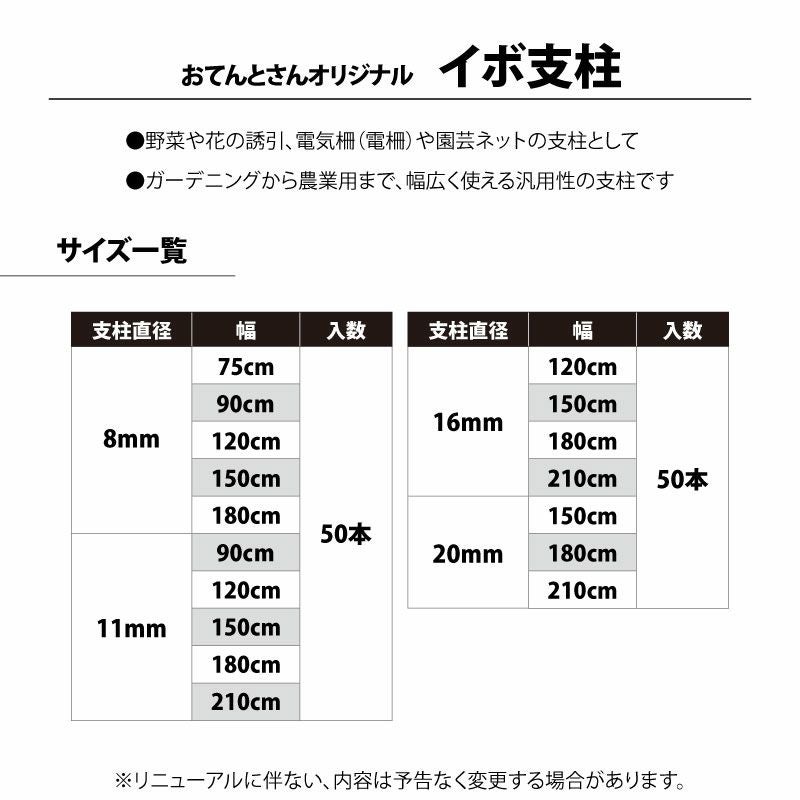 他の画像を見る 支柱 イボ付 内キャップ式 農業資材 園芸用品 園芸支柱 イボ支柱 50本入 サイズを選択 直径:8mm・11mm・16mm・20mm/長さ:75cm・90cm・120cm・150cm・180cm・210cm 販売価格 ¥ 2,200 税込 〜 販売価格 ¥ 税込 詳細を見る お気に入りに登録する (0)