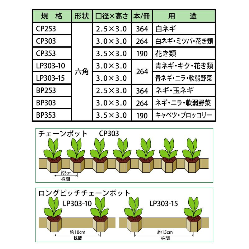 他の画像を見る ニッテン ロングピッチチェーンポット LP303-10 径3cm×高3cm 株間10cm 穴数264 1冊 青ネギ キク 花き類 販売価格 ¥ 380 税込 カートに入れる お気に入りに登録する (0)