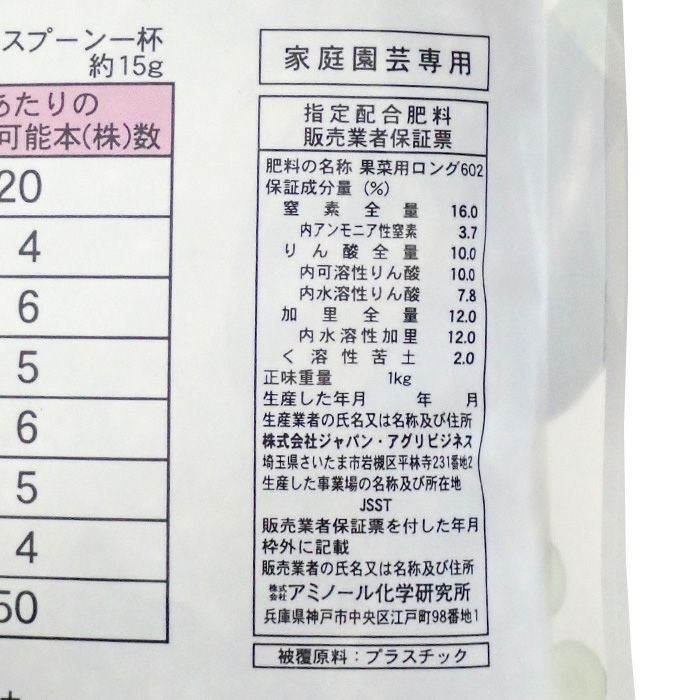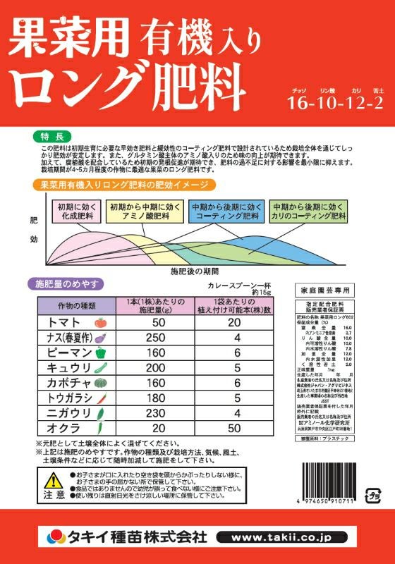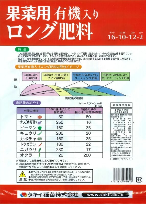 他の画像を見る アミノ酸・腐植酸配合 野菜元肥 家庭菜園 ガーデニング タキイ種苗 果菜用 有機入りロング肥料 16-10-12-2 内容量1kg 販売価格 ¥ 1,078 税込 カートに入れる お気に入りに登録する (0)