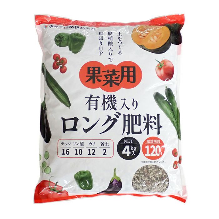 他の画像を見る アミノ酸・腐植酸配合 野菜元肥 家庭菜園 ガーデニング タキイ種苗 果菜用 有機入りロング肥料 16-10-12-2 内容量4kg 販売価格 ¥ 3,300 税込 カートに入れる お気に入りに登録する (0)