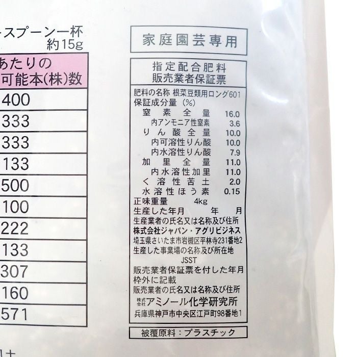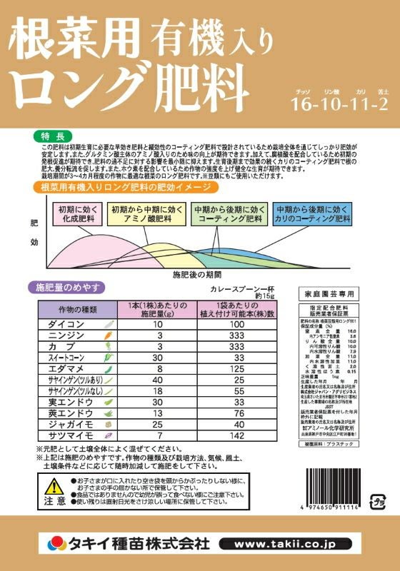 他の画像を見る アミノ酸・腐植酸配合 野菜元肥 家庭菜園 ガーデニング タキイ種苗 根菜用 有機入りロング肥料 16-10-11-2 内容量4kg ホウ素入り 販売価格 ¥ 3,300 税込 カートに入れる お気に入りに登録する (0)