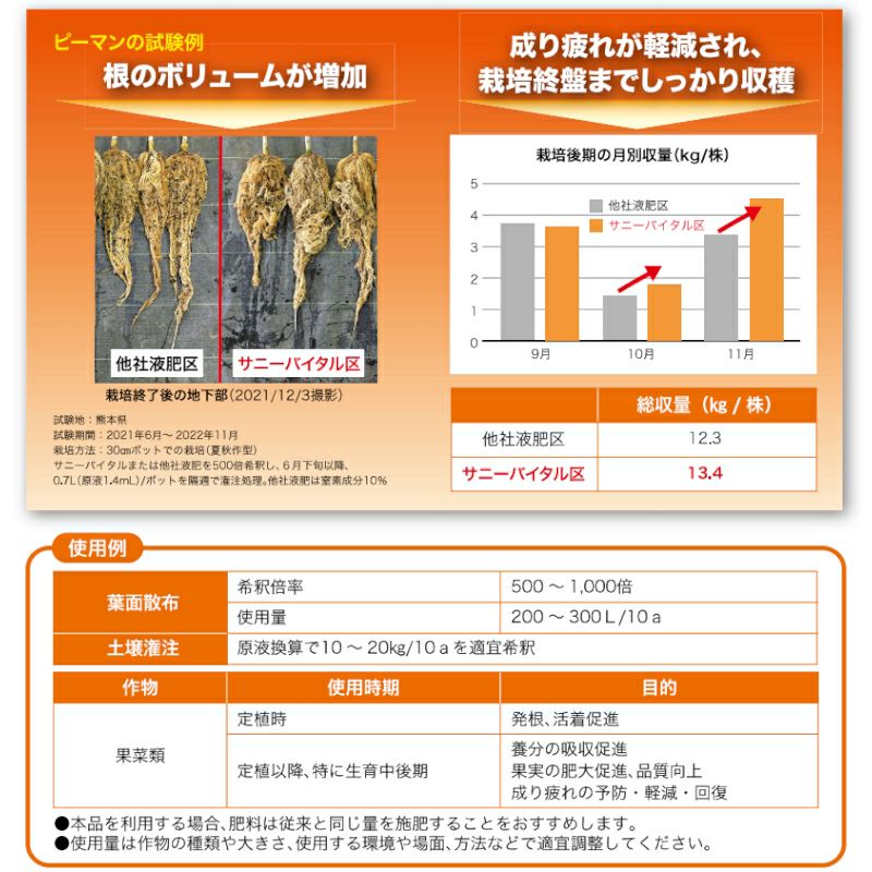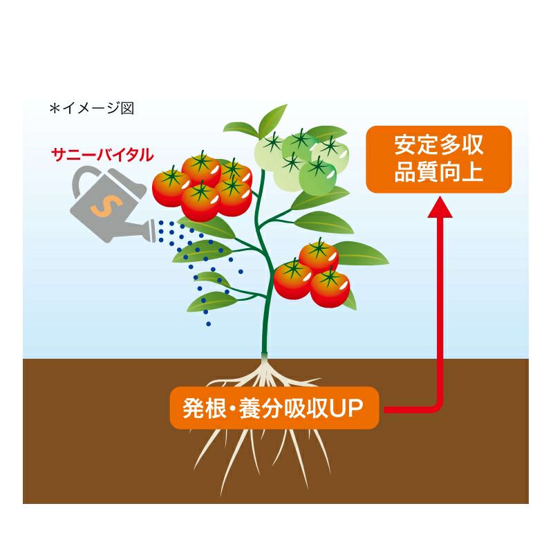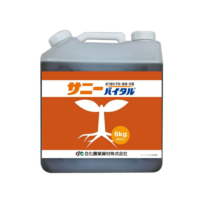 他の画像を見る 成り疲れ予防・軽減・回復!特に生育中後期におすすめ サニーバイタル 6kg (5L) 住化農業資材 バイオスティミュラント BS資材 販売価格 ¥ 6,490 税込 カートに入れる お気に入りに登録する (0)