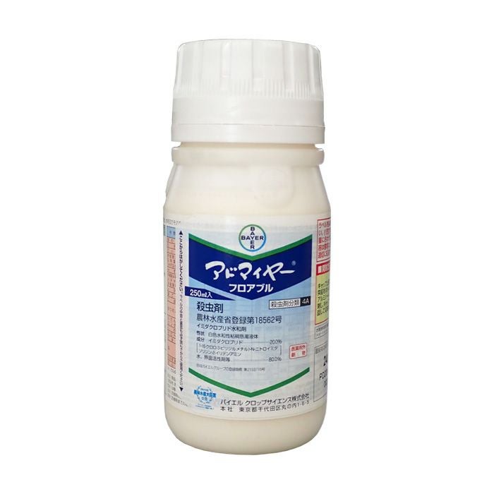 アドマイヤーフロアブルはバイエル クロップサイエンス(株)で合成・開発された、新しい系統 の殺虫剤で、かんきつのアブラムシ類、ハモグリガ、スリップスや野菜、花卉の各種害虫を的確に、 しかも長期間防除することができます。優れた残効性により、防除回数を減らすことができ省力防 除が可能です。また、殺虫作用が異なり抵抗性害虫にも高い効果があります。