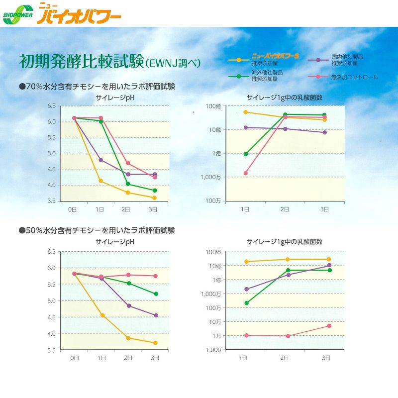 ニューバイオパワーは、材料の水分含有量に関わらず圧倒的な増殖スピードと強力な乳酸菌の発酵力で有害細菌の増殖を抑制し、良質なサイレージを作ります。