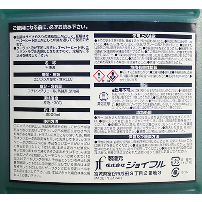 他の画像を見る クーラント液 冷却水 不凍液 エンジンの冷却 LLC 防錆 メンテナンス 農機具 そのまんまクーラント -30℃ 2L J-33 緑 販売価格 ¥ 968 税込 カートに入れる お気に入りに登録する (0)