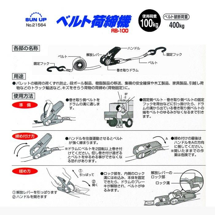他の画像を見る 荷締め 結束 荷くずれ防止 荷物運搬 荷物固定 SUN UP ラチェット式 ベルト荷締機 BR-100 5m 品番21564 使用荷重100kg 販売価格 ¥ 1,180 税込 カートに入れる お気に入りに登録する (0)
