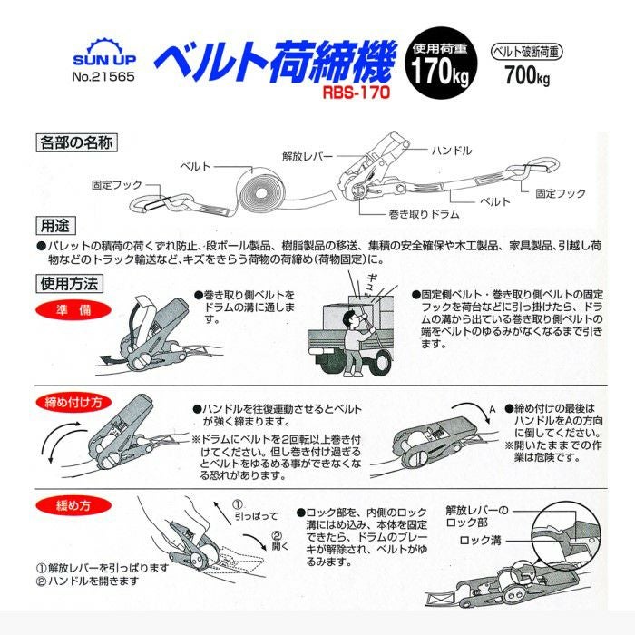 他の画像を見る 荷締め 結束 荷くずれ防止 荷物運搬 荷物固定 SUN UP ラチェット式ベルト荷締機 パワフル500 RJ-500 6m 品番21564 使用荷重500kg 販売価格 ¥ 4,925 税込 カートに入れる お気に入りに登録する (0)