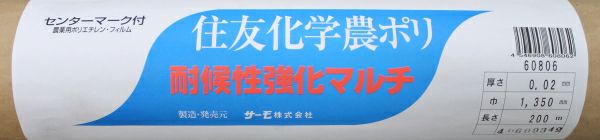 他の画像を見る 代引不可 日時指定不可 住化積水 透明マルチ 耐候性強化 センターマーク入り 厚み0.02mm×幅135cm×長さ200m 販売価格 ¥ 4,815 税込 カートに入れる お気に入りに登録する (0)
